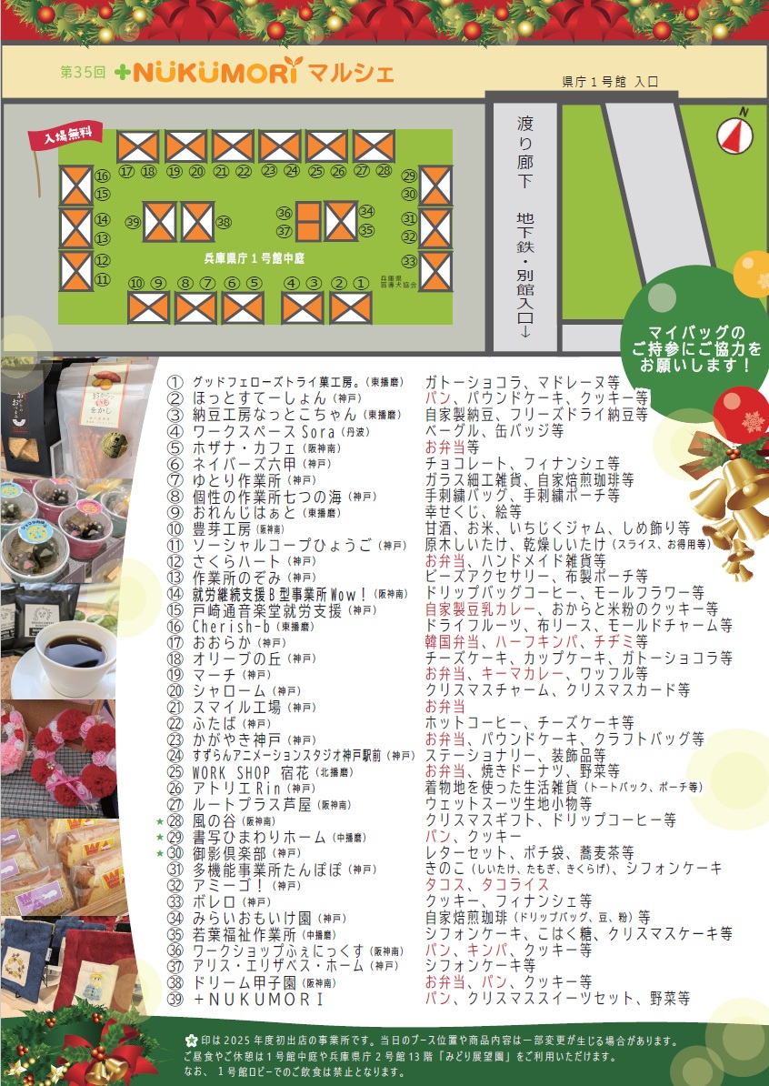 令和7年12月18日(木)11時30分~13時30分 兵庫県庁1号館中庭にて「第35回+NUKUMORI(ぷらすぬくもり)マルシェ」を開催します。