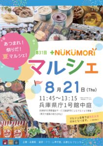 令和7年8月21日(木)11時45分~13時15分 1号館中庭にて「第31回+NUKUMORI(ぷらすぬくもり)マルシェ」を開催します。