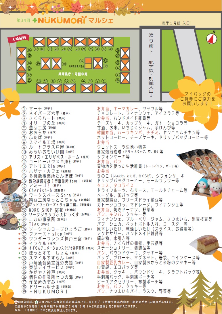 令和7年11月27日(木)11時30分~13時30分 兵庫県庁1号館中庭にて「第34回+NUKUMORI(ぷらすぬくもり)マルシェ」を開催します。