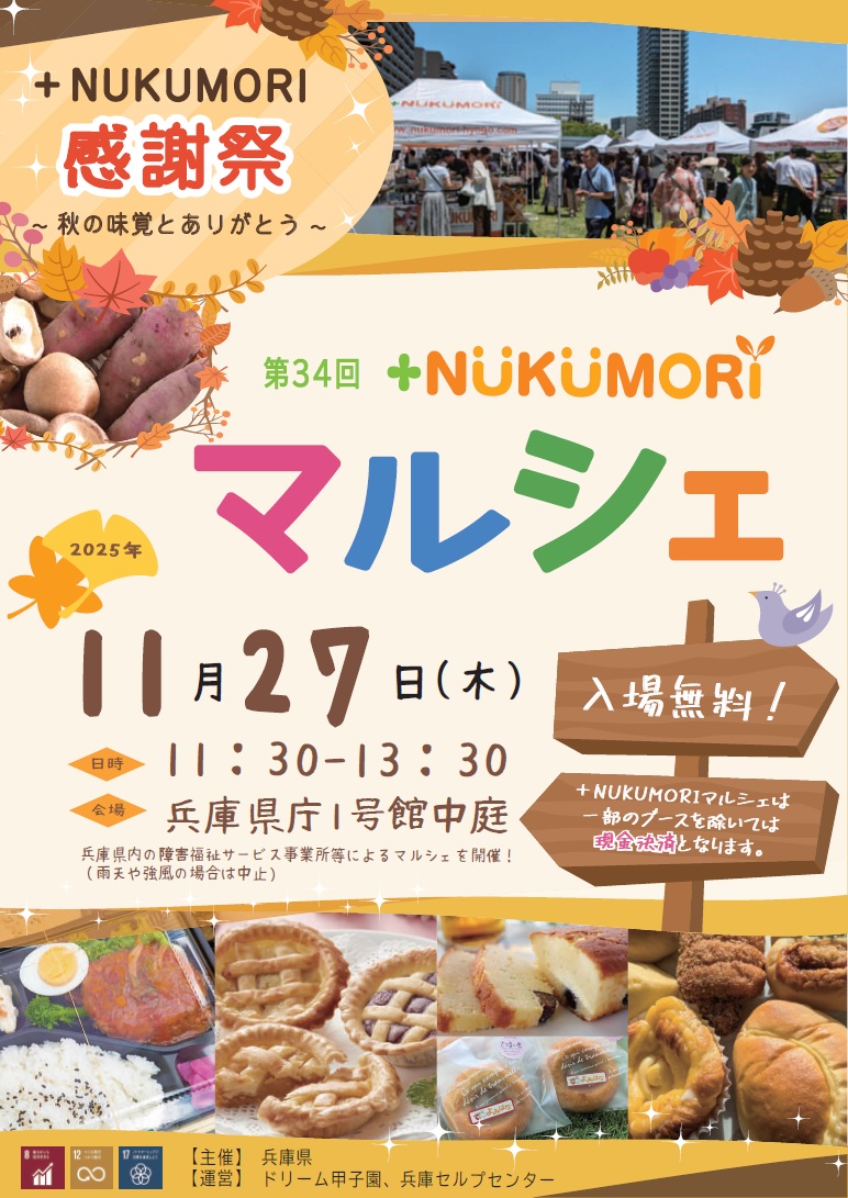 令和7年11月27日(木)11時30分~13時30分 兵庫県庁1号館中庭にて「第34回+NUKUMORI(ぷらすぬくもり)マルシェ」を開催します。