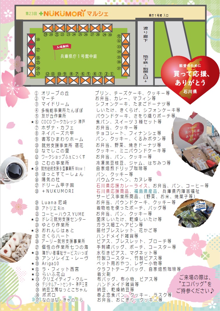 あわせて、兵庫県内の障害のある方が働く事業所で作られたお弁当、パン、焼菓子、野菜、雑貨などの商品や福島県産品を37事業所が販売します。
