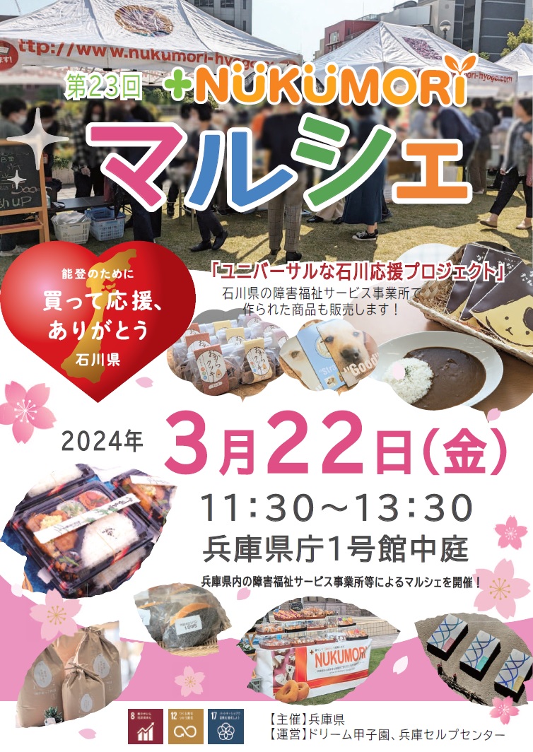 令和6年3月22日(金)11時30分~13時30分 1号館中庭にて「第23回+NUKUMORI(ぷらすぬくもり)県庁マルシェ」を開催します。