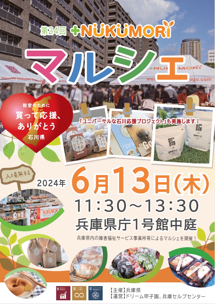 令和6年6月13日(木)11時30分~13時30分 1号館中庭にて「第24回+NUKUMORI(ぷらすぬくもり)県庁マルシェ」を開催します。