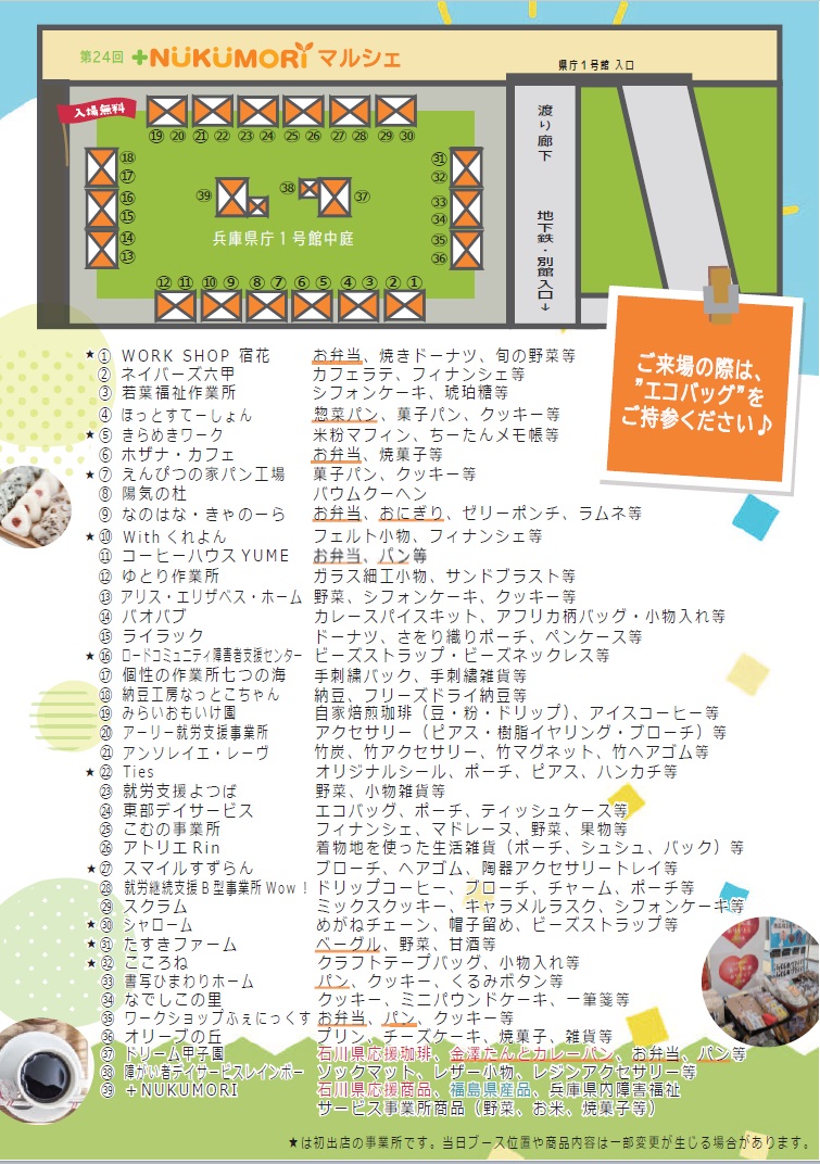 あわせて、兵庫県内の障害のある方が働く事業所で作られたお弁当、パン、焼菓子、野菜、雑貨などの商品や福島県産品を39事業所が販売します。